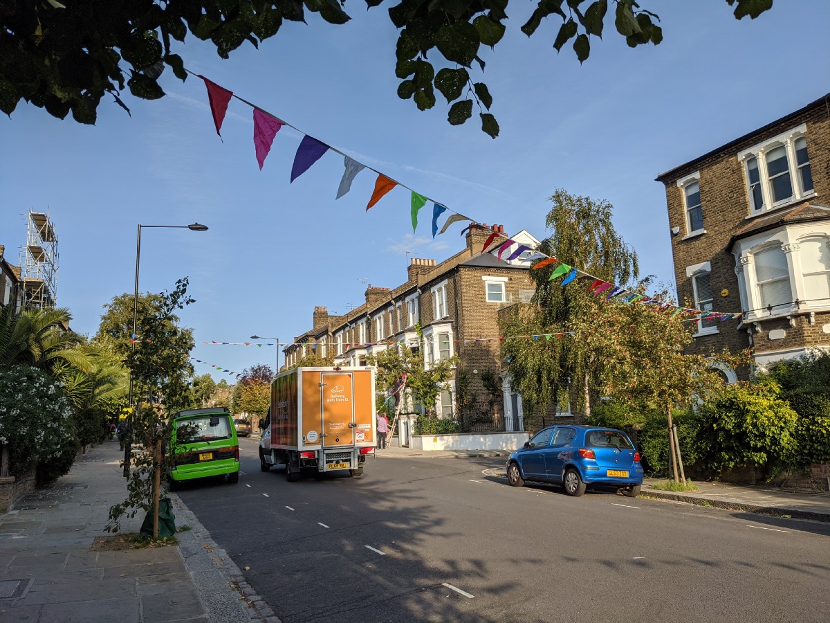 17:12:16 The bandstand again. | 17:28:35 They were setting up bunting on Lady Somerset Road for their annual street party. | 17:28:38 | 18:03:39 My recently acquired case of Gevrey Chambertin. |