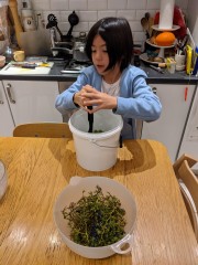 15:46:32 Erika (in slightly weird shady light) enjoying the first apple from the tree this season. | 15:46:36 Technically this was the second apple we'd taken from the tree, but the first went into cider, so this was the first we'd actually eaten. | 19:47:17 Erika helping to press the grapes to make wine. | 19:47:24 |