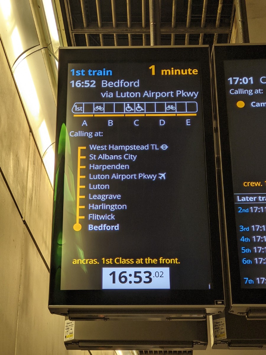 10:43:47 | 10:45:37 The trains were a bit disrupted today, and it seemed to take a long time to get to Hassocks - an hour into my journey and I'd only made it as far as East Croydon. | 11:04:28 Still, things did improve a bit from there on, as there was plenty of space in fake first class on the Thameslink. | 11:20:57 ..and once out of London there were lovely views of the countryside to be had. |