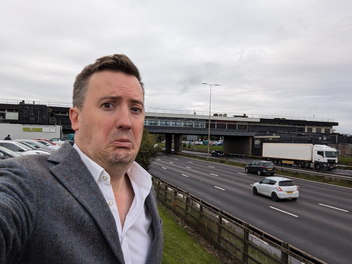 16:16:44 Me at the services on the M1. It always looks a bit grim here. | 16:54:34 Erika thought it would be funny if we put on false moustaches for when we arrived at Mum’s house. | 16:59:44 Chie and Erika trying out Mum’s new futon. Note George is now wearing my moustache. | 17:11:56 Erika trying out the stairlift. |