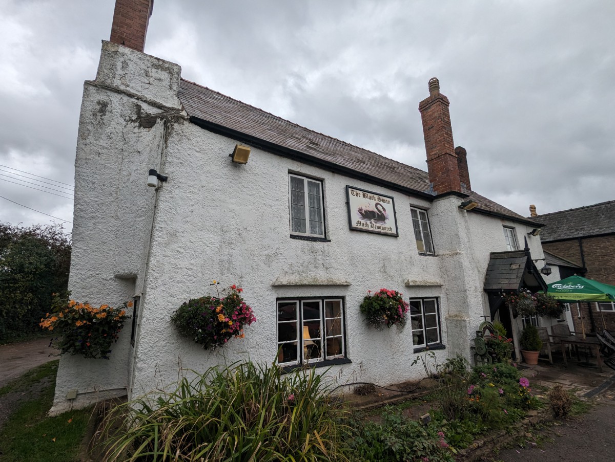 11:38:04 Stopping at a motorway services somewhere between the East Midlands and Hereford. | 11:38:29 Strangely from the window of the services we could see out to this bench with a couple of garden gnomes. | 13:05:34 The Black Swan at Much Dewchurch. | 13:40:06 Chie and Erika having lunch at the Black Swan. |