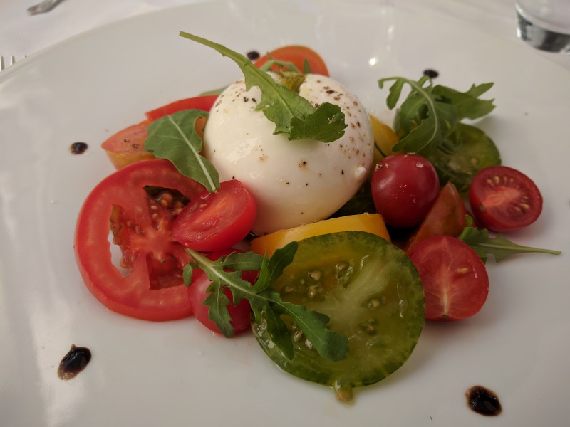 13:16:39 Possibly I enjoyed the Champagne aperitif more than the actual food, but still overall it was a very pleasant experience. | 13:23:02 My starter, was hoping to have the traditional Monegasque Barbajuans, but here they apparently have meat in (that's not the traditional recipe I believe, which is just cheese and swiss chard). So more mozzarella (well technically burrata) and tomatoes instead. Didn't actually take a picture of my main course - a risotto - which was slightly underwhelming if I'm honest. | 13:44:47 Close up on the view down to the sea. | 13:44:57 On the way to the loo I leaned out of one of the windows to take this picture of the terrace. |