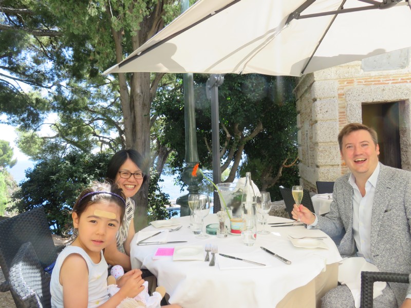 12:55:04 | 13:15:25 Our table for lunch at Castelroc. This was a lovely spot with nice sea views through the trees. | 13:15:32 | 13:16:25 Erika said in this suit I "look like a Monaco person". Nobody else was wearing anything like it. |