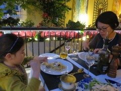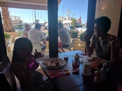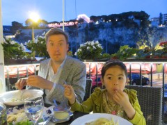 19:55:36 In Fontvielle harbour. | 19:55:41 ...with views up to Le Rocher and the Prince's palace. | 20:19:40 Chie and Erika with their spaghetti alle vongole, which they shared, despite the protestations of the owner. | 20:19:49 |