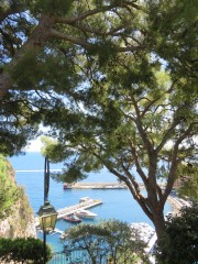 09:57:31 My extremely French breakfast. | 12:11:53 The view from our balcony again, after returning from our morning swim in the hotel pool. | 12:27:06 En route through Monaco to Le Rocher where we would be having lunch. I liked the view of the mountains in the distance. | 12:47:02 Walking up the path leading to the top of Le Rocher. This tall tree reminds me of a previous visit when it was very windy, and it was bending over sidewards. |