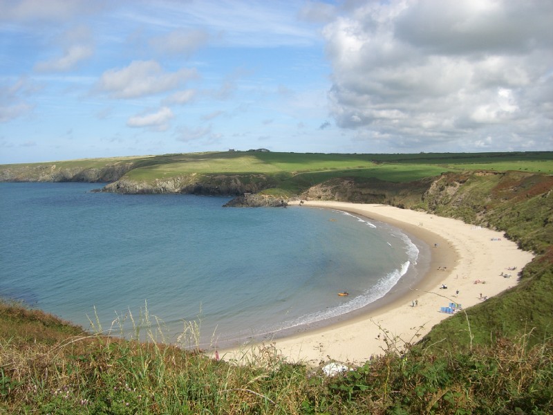 | 13:52:01 Lovely sea and sky. | 13:54:09 The view along to Anelog (that little mountain on the end), and you can just make out a certain black dog trotting along the path. | 14:02:00 Even a bit of sun glimmering on the sea here. |