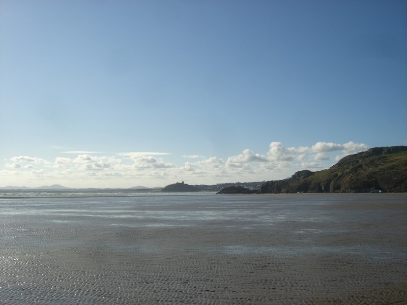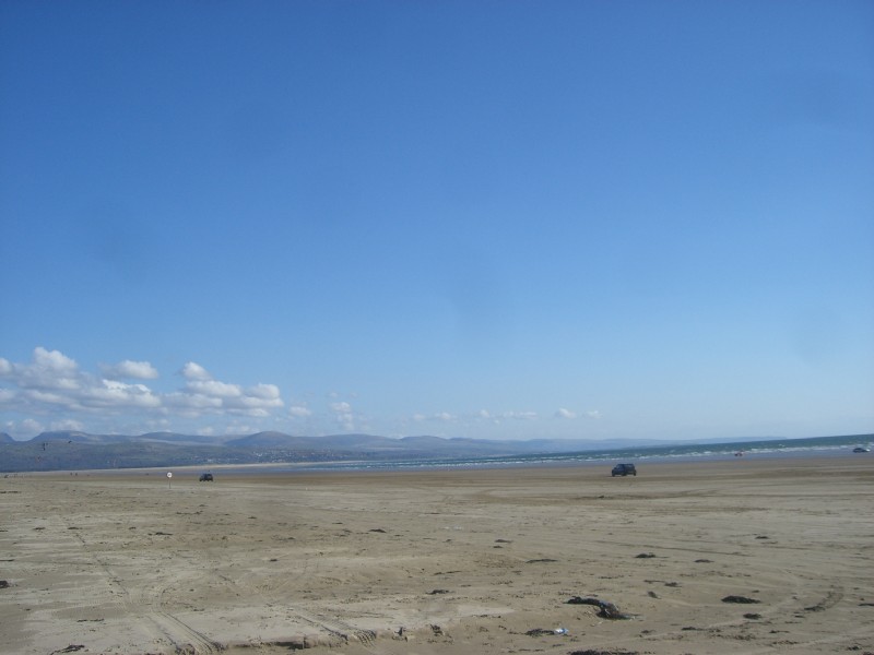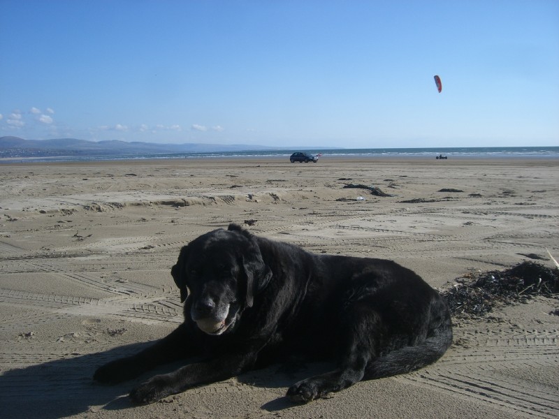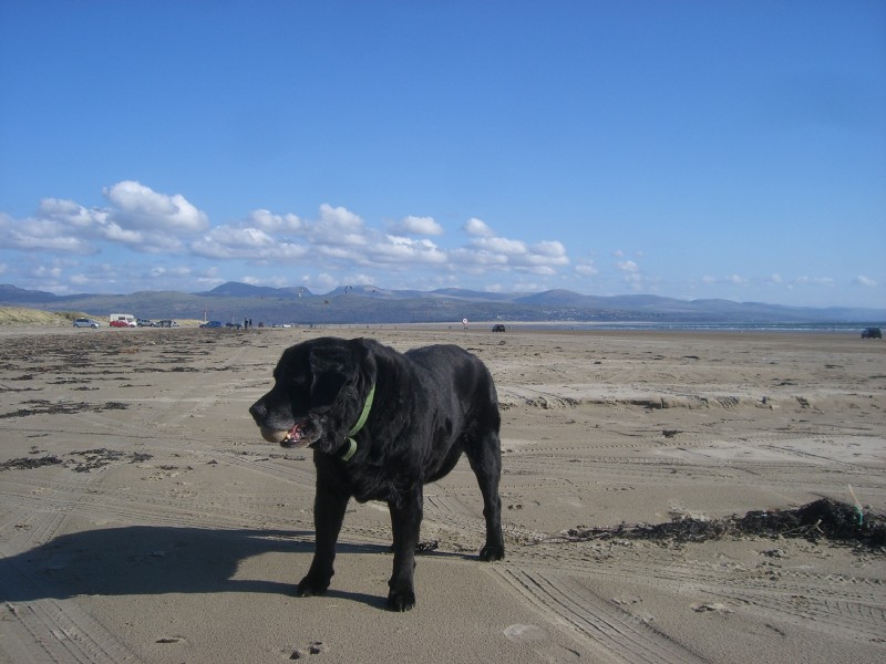 | 16:08:10 On the way out of Portmeirion now, and here's a bird in a tree. | 16:33:55 On the way back we went by way of Black Rock Sands, the beach we used to go to when I was a kid. | 16:34:04 Yates is quite fond of the beach. |