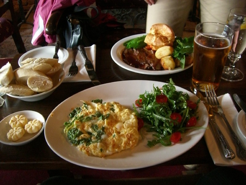 | 12:13:50 We decided we should stop here and have lunch. Here we are in the back bar, Chie enjoying the grand fire place. | 12:17:09 Our lunches - roast beef for Chie, a spinach and goats cheese omelette for me. | 12:27:15 Me with the bar (note the hanging hops) behind me. |