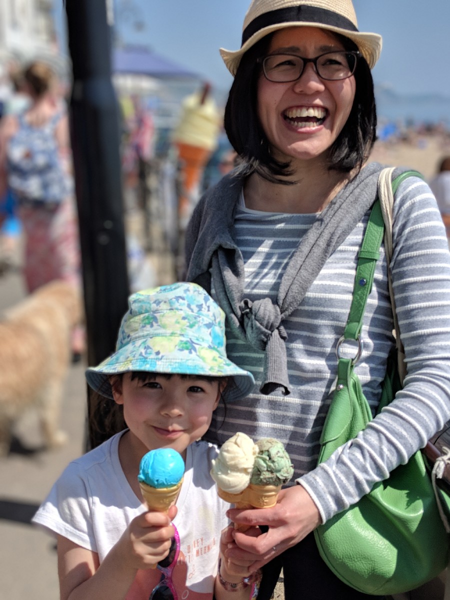11:52:13 Erika dipping her toes in the sea. | 11:52:53 | 12:42:24 Lunch at a place on the seafront. | 13:11:38 Erika with this terrifying bright blue bubblegum flavour ice cream. |