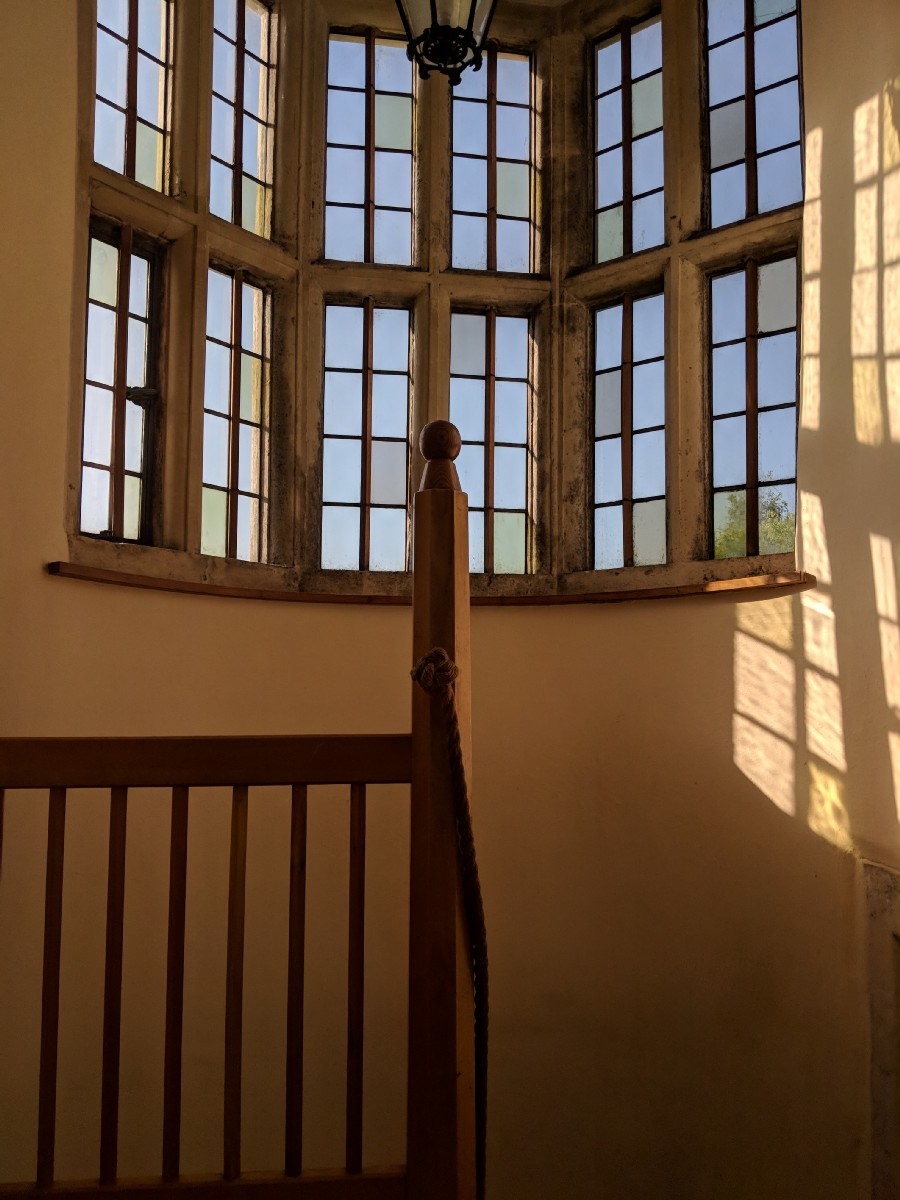 17:04:30 Sun glistening on the sea. | 17:38:10 Erika fell asleep in the car on the way back to the gatehouse. | 17:48:44 The stairwell at the gatehouse. Nice light here. | 17:59:09 We decided to have pre-dinner drinks and nibbles out on the lawn, and Chie and Erika also did some drawing. |