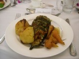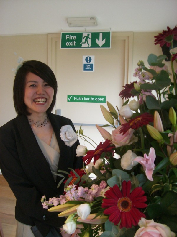 | 16:22:35 Chie hiding behind some flowers. Can you see her? | 16:22:46 Fire exits remind me of one of the pictures from my other friend Simon's wedding. | 18:04:17 Dinner! The food was rather good I thought - here's the vegetarian option... |