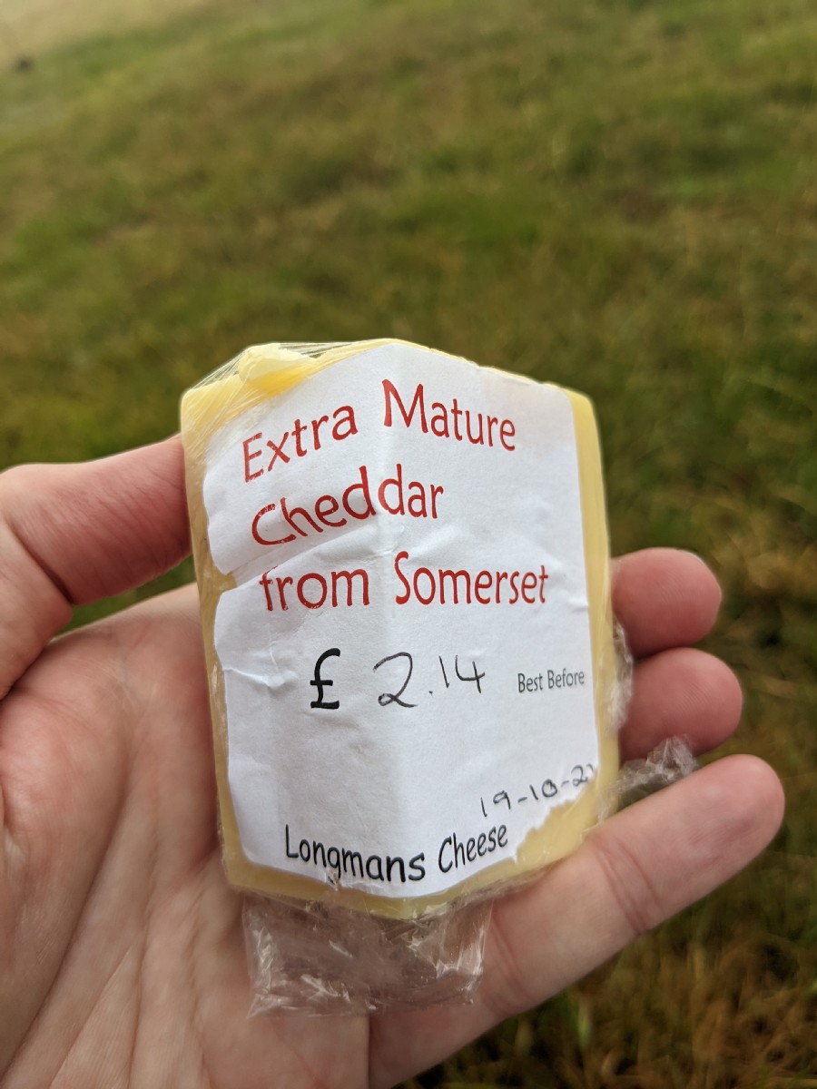 14:16:09 Still not much visibility - I had thought it was supposed to be clearing by this point of the afternoon! | 14:41:40 A late lunch, because I had struggled to find a nice spot to sit, the section of the walk beyond Maiden Newton being largely through farmer's fields. In fact even this spot turned out to be less than ideal, when I was persuaded to move on by a stampeding herd of cows, with only a very flimsy looking wire fence between me and them. This cheese however (bought in the village shop in Maiden Newton) was a bargain and very tasty. | 15:19:54 The manor house in the hamlet of Toller Whelme, which looked rather impressive I thought. | 15:20:00 |