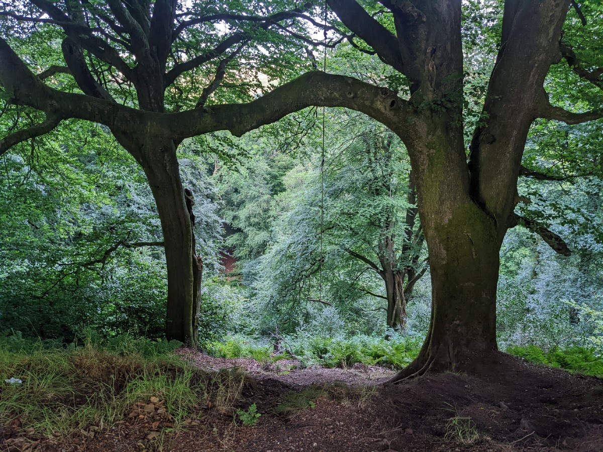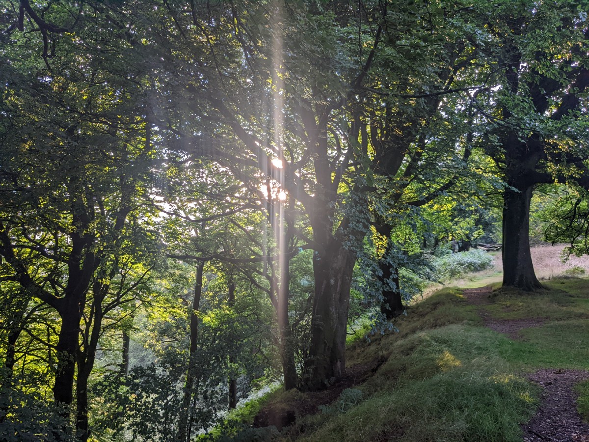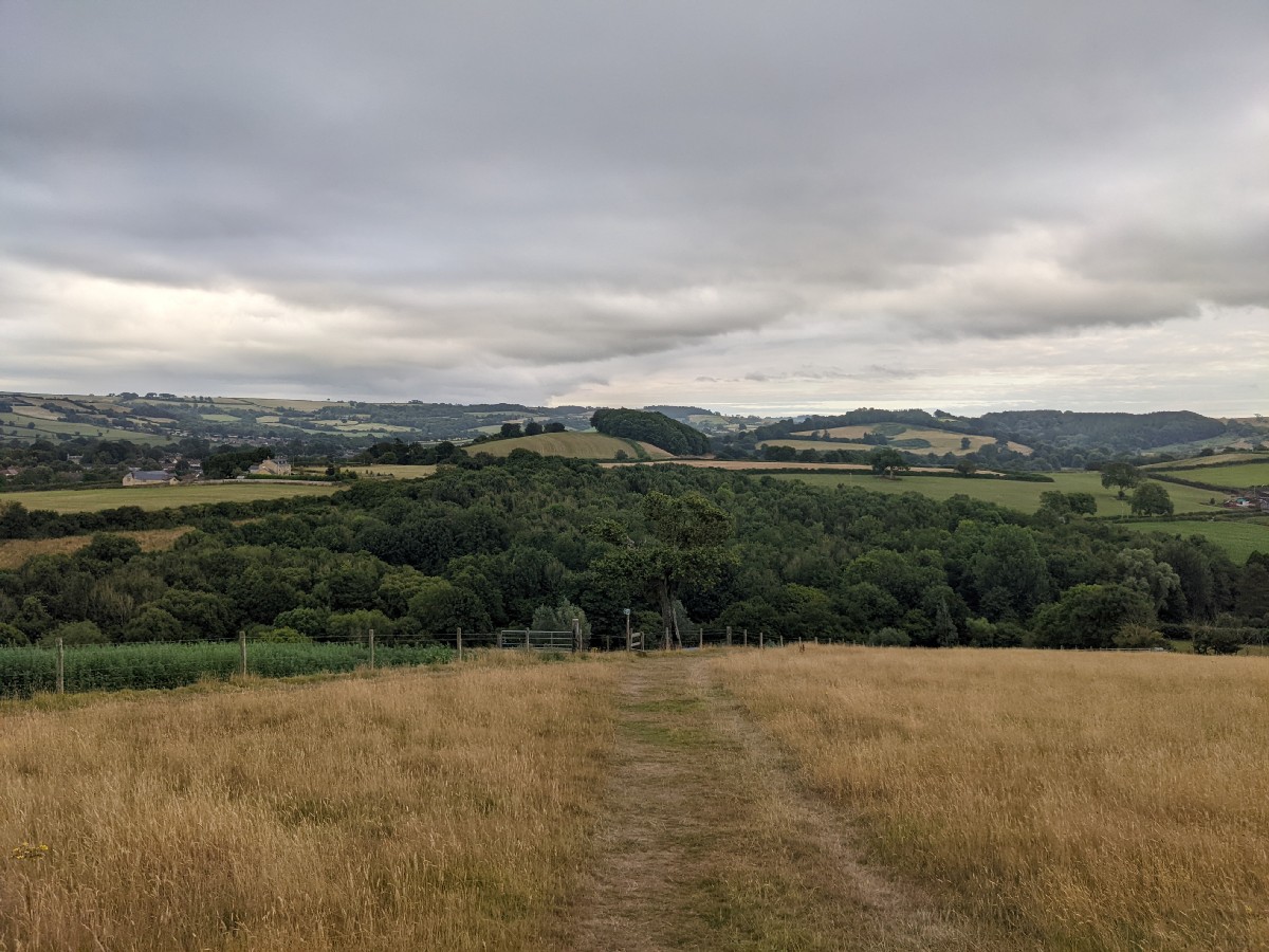 19:50:13 There was another hill between this and the previous photo - Waddon Hill - which apparently is the site of a Roman Fort, but there was no public access other than the footpath skirting along one edge, so I kept on walking to here, Lewesdon Hill. | 19:50:47 Although wooded at the top, there were some occasionally glimpses of views through the gaps in the trees. | 20:01:13 | 20:02:24 I think this is right at the top of Leweson Hill now, which is apparently the highest point in Dorset. |
