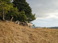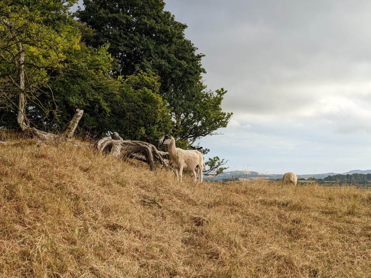 19:01:57 Very close to the top of Gerrard's Hill. | 19:05:18 A nice little copse of trees atop Gerrard's Hill, it had a slight feeling of a barrow or similar about it. | 19:05:38 The trig point and the view from Gerrard's Hill. I was rather taken with this little hill, and had it not been so overrun might have considered staying here for the night. | 19:09:36 One finally shot of the sheep atop Gerrard's Hill before heading on. |