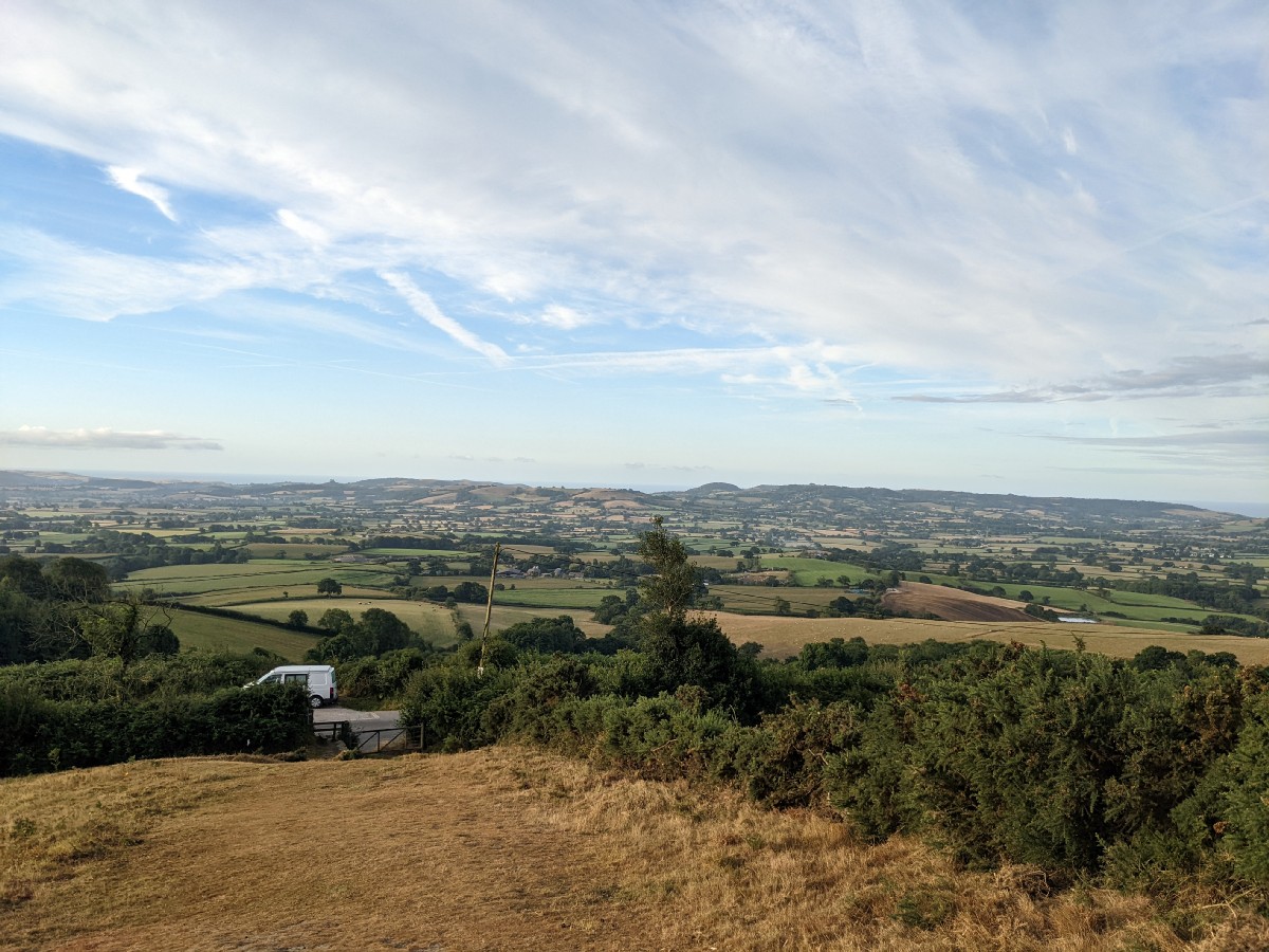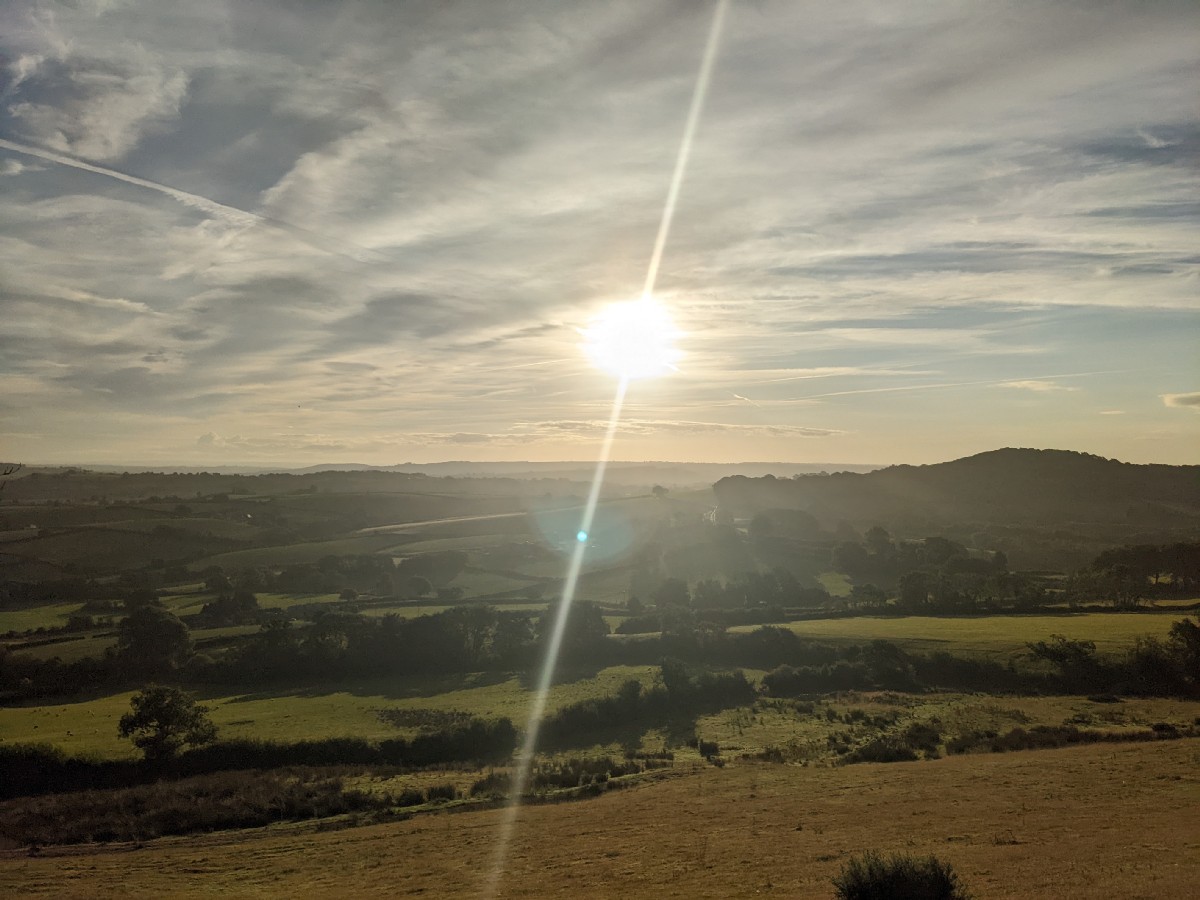 06:51:39 A bit of a slog from Lewesdon Hill to here, Pilsdon Pen, but this was a spectacular spot. Would have been lovely to have been here at sunrise given the wide open views, but never mind! | 06:51:50 In my stupid sun hat, which makes me look like a bit of a yokel here, because it was already quite sunny even at this time of the morning. | 06:59:53 Heading down to the road from Pilsdon Pen. I decided to cheat quite a lot from here on, and followed the road from here to the next landmark along thr route - Lambert's Castle. The road was a much more direct route than the Wessex Ridgeway took between the two. | 08:27:57 At Lambert's Castle now, and I found a much appreciated bench to have a sit down on. |