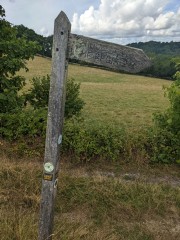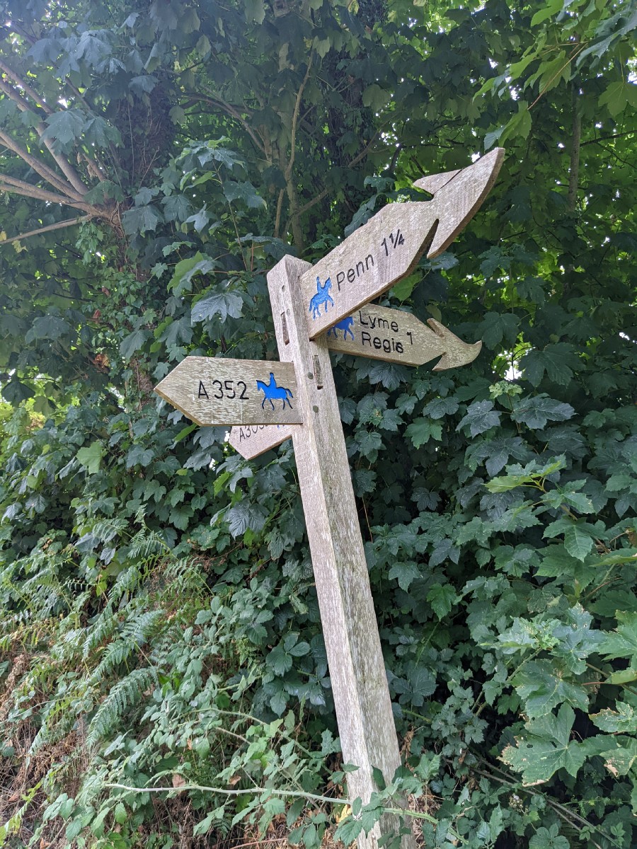 10:14:12 Once again after my shortcut I rejoined the Wessex Ridgeway, then had quite a slog up Penn Hill, which I found rather hard work. However I was at least rewarded with this pleasant view. | 10:18:24 Another one of those very English vistas I thought. | 10:29:27 Just after crossing the A35, this sign appeared to suggest it was only 2 3/4 miles from here to Lyme Regis. The remainder of the walk felt a fair bit longer than that! | 11:45:40 The difference between this and the previous photos seems to suggest it took me an hour and a quarter to walk less than two miles. I did have a rather overgrown bit of woodland (Hole Common) to battle through, and I did have a break there to take my boots off for a bit, but I'm still very sceptical of these distances. |