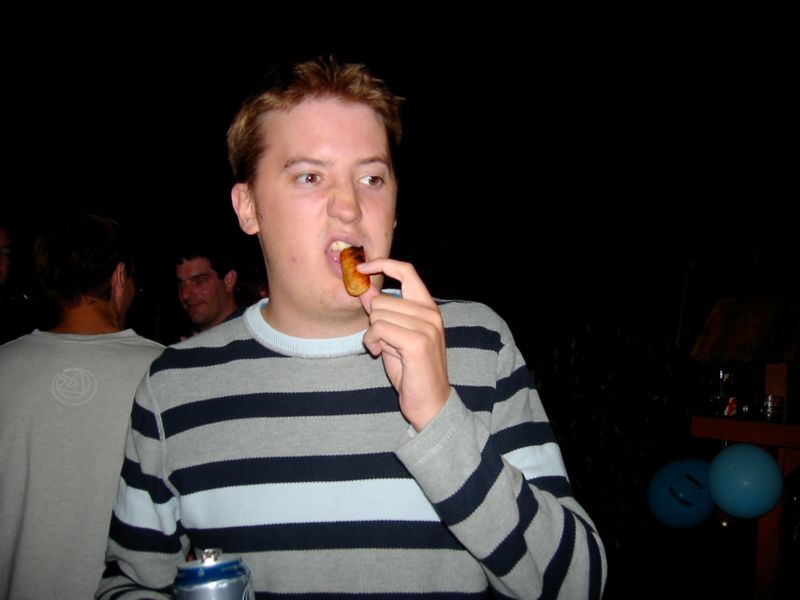 22:06:05 Me eating a stolen sausage (for which I think I have to apologise to Johen). Not sure why I'm scowling here, possibly it is a look of disdain at the photographer (probably Michelle) trying to get me do something cheap and smutty, which is clearly beneath someone of my stature. |