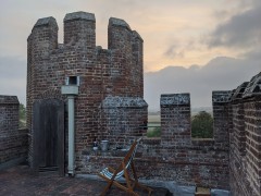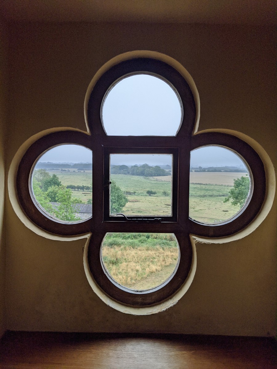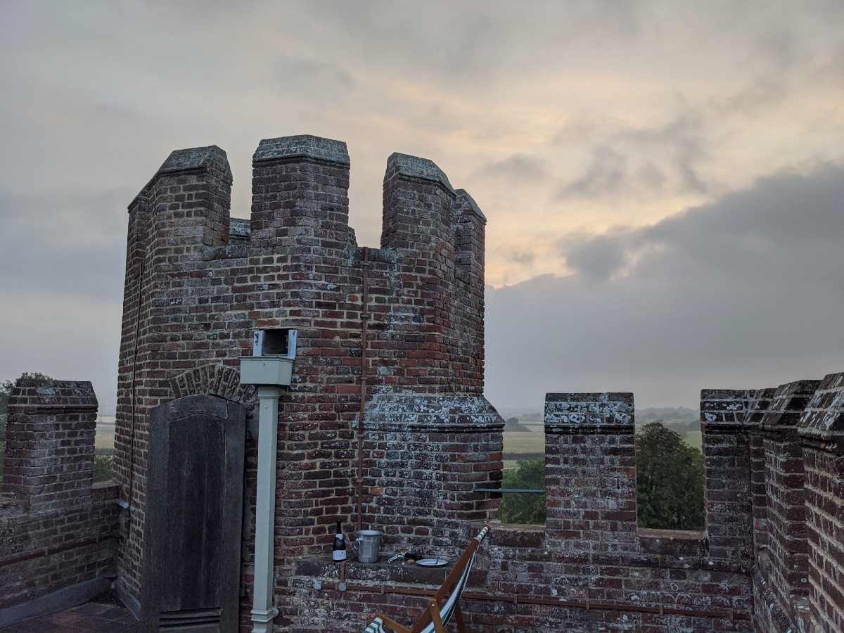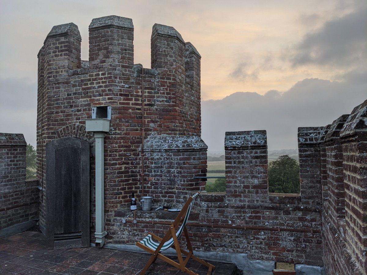 18:04:35 Exterior views of the windows. | 18:04:51 Bench outside the tower. | 18:39:45 Time to taste some local wine up on the roof I decided. So I cracked open the bottle of Rathfinny I had bought earlier in the day. | 18:40:38 Cheers. |