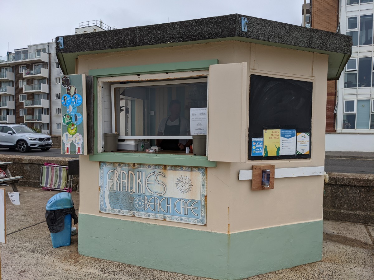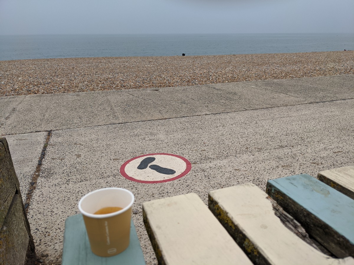 10:26:26 Frankie's Beach Cafe, which did a very respectable espresso and a nice toasted sandwich. | 10:26:59 My espresso with a sea view. | 10:33:14 Also my toasted sandwich, again with a sea view. | 10:41:58 The view along the beach to the first of the white cliffs. |