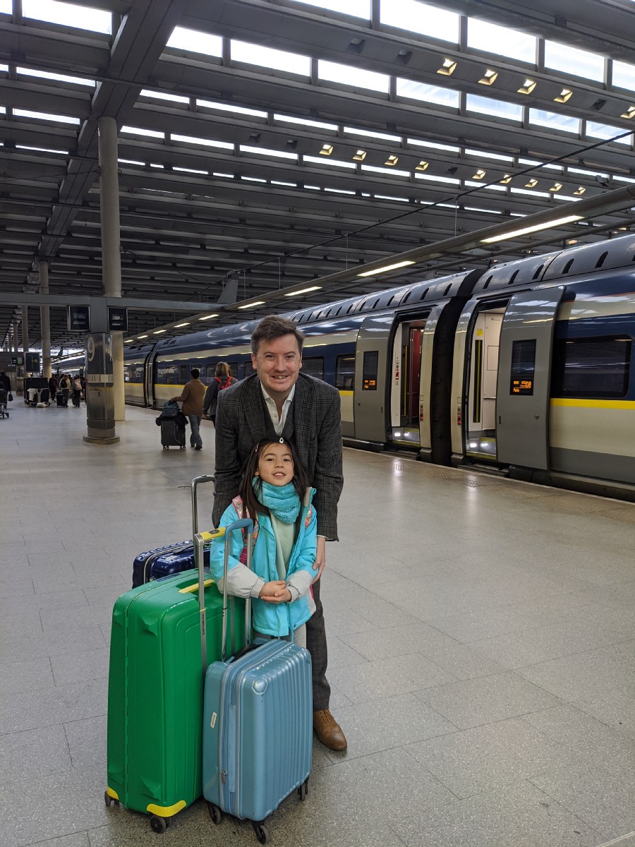10:06:02 Me and Erika at St Pancras about to board the Eurostar. | 10:09:38 Chie and I briefly got off the train asthe luggage racks were at the opposite end of the carriage and it was quicker this way. Erika looked a bit surprised. | 10:25:35 Me and Erika on the Eurostar. Chie had brought Erika's Japanese homework along with her thus why Erika is looking very studious here. | 12:30:23 Chie and Erika on the Eurostar. |