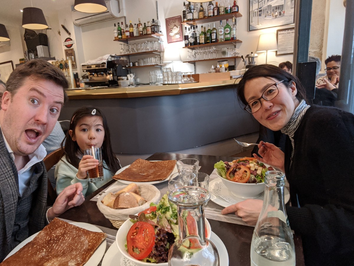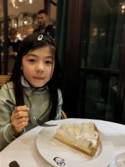 12:39:17 Erika watching videos on her iPod after finishing her homework. | 15:14:05 Now in Paris, having a late lunch at a creperie near our hotel, around Gare de Lyon. | 15:14:11 | 15:55:07 Erika very diligently finishing off the chocolate mousse. |