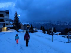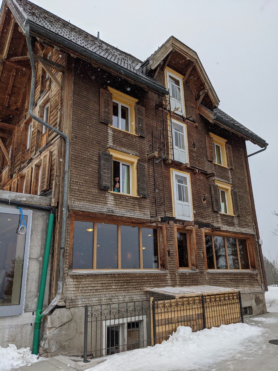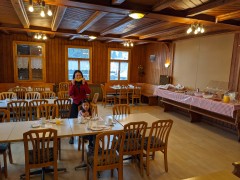 17:39:02 Despite leaving it outside in the snow for nearly an hour it wasn't actually particularly well chilled - this method doesn't seem to work very well. | 18:15:31 Heading to dinner. | 18:17:30 Restaurant Tannenboden, where we went for dinner. | 18:54:43 Me and Erika at dinner. The food wasn't particularly great, but it had the benefit of being very close to our hotel. |