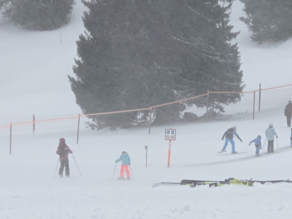 10:43:37 Chie and Erika on the slope. | 11:18:51 We had a very early lunch as our ski lesson was scheduled from midday to 2pm. This is the "Alpermagronen" at the restaurant next to the training slopes. It wasn't great, but it stopped me being hungry while we were having our lesson. | 11:49:53 The weather took a turn for the worse as our lesson approached, and it looked a bit blizzardy out there. | 11:54:39 Lots of kids having ski lessons today. One group was being instructed by somebody dressed in a rabbit outfit. |