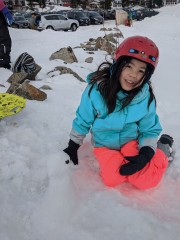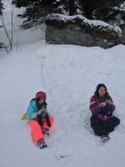 10:11:30 Somebody had built this rather impressive little snow dwelling. | 10:14:12 Chie and Erika exploring the snow. | 10:20:30 Erika trying to sledge. It was a bit difficult to get going on this particular slope. | 10:50:39 Instead we had go at building a snowman. |