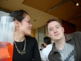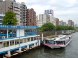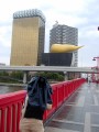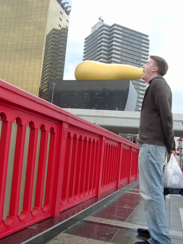 Just over the river from Kamiya Bar is the world headquarters of the Asahi drinks company. In the background you can see a slightly odd sculpture which is sort of the logo for Asahi, but rather unfortunately is often referred to as "the golden turd". Chie is clearly embarassed and therefore hiding from the camera.