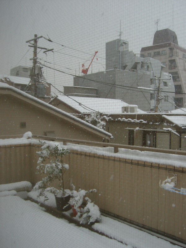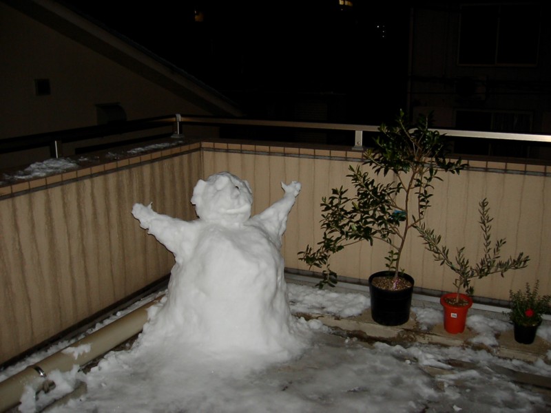 Sunday 13:19 Our large balcony provided ample snow to enable Geoff's construction. When we were first deciding on a place to live, this added benefit never crossed my mind! |