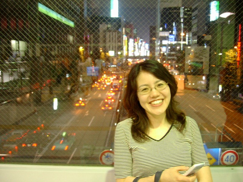 21:51:56 Chie in the station, with the neon lights of Shimbashi behind her.