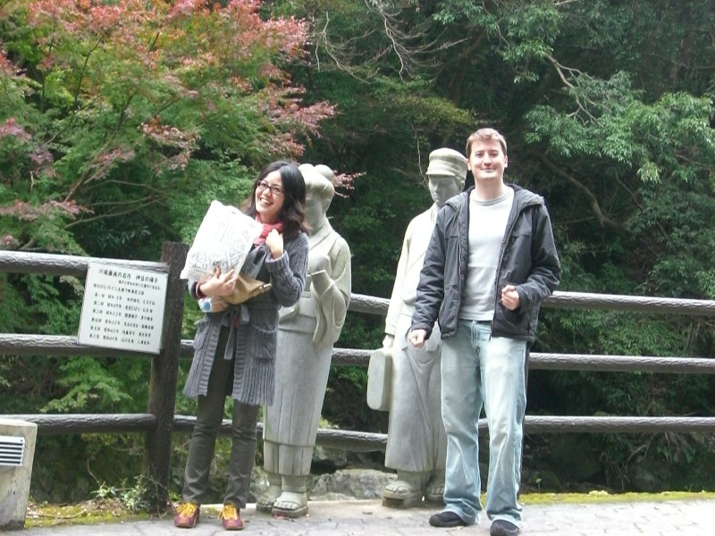The final waterfall had an onsen complex built into the rockface at one side of the valley - here's Chie taking a bit of a peek into one of the caves.
