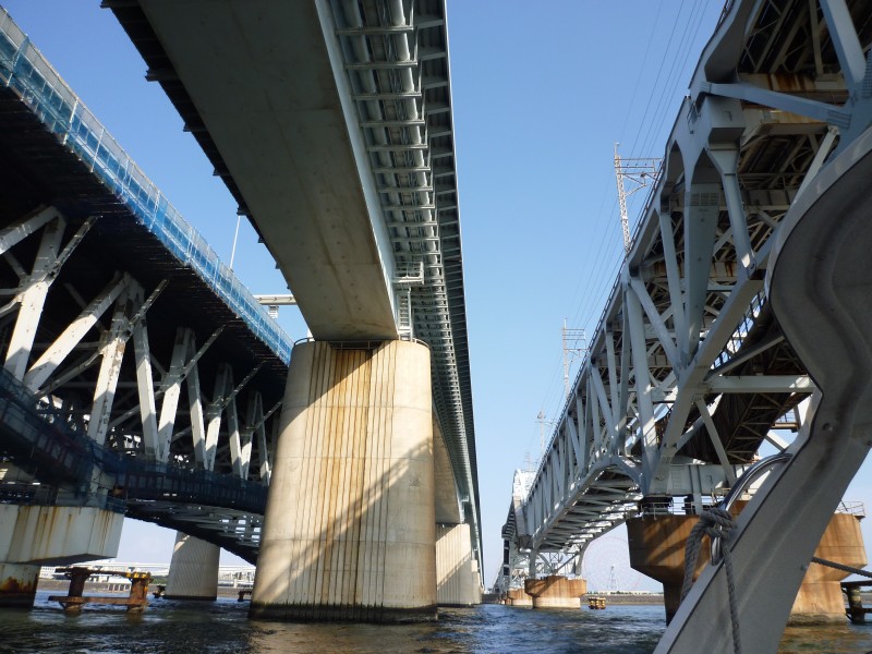 | 12:19:02 The wake behind our boat. | 12:21:06 That hotel is part of Tokyo Disneyland (or do I mean Disney Sea?). | 12:22:05 Under the bridge. |