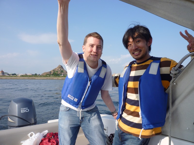 | 14:59:58 Me pretending to take the helm (rest assured this is purely for the benefit of the picture). | 15:05:03 Aoki-san doing a quick spot of fishing. | 15:30:37 ...back at the Marina now, here we are disembarking. |