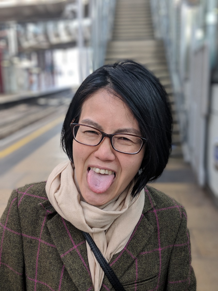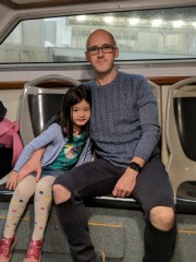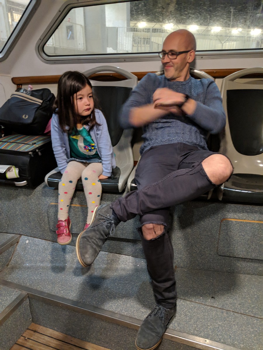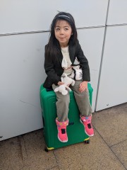10:30:47 On the train on the way to Gatwick. | 10:39:35 Erika sitting on one of our suitcases at Farringdon. | 10:39:45 I took the opportunity to test out portrait mode on my phone. | 10:40:11 Possibly the effect of portrait mode is a bit lost with such a plain background. |