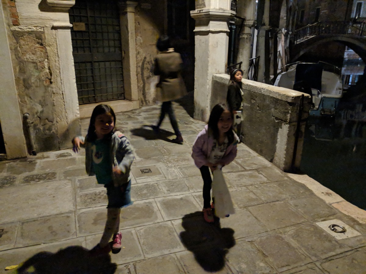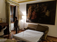 21:58:56 Chie and Erika in our bedroom at the apartment. | 21:59:01 Erika had this huge oil painting above her bed. | 22:39:08 A bit of street art in Venice. | 22:46:47 Night time view from the Rialto Bridge. |