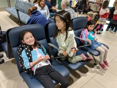 12:58:23 At Gatwick, after meeting up with Leon, Aiko and Mei. The large bear in Harrods in duty free here is in fact for sale. How exactly do you fit this in the overhead luggage compartments on the plane? | 12:58:24 | 12:58:25 | 13:21:05 Aiko, Erika and Mei waiting to board the plane. |