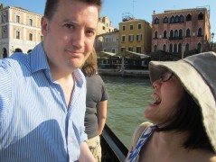 17:46:57 We were determined to try the traghetto - the little gondola ferries which let you cross the grand canal for a mere 50 Euro cents. | 17:48:05 There's the gondolier. | 17:48:38 A rather nice lamp. | 17:50:12 Chie and I standing up on the gondola, as apparently you're supposed to - this was actually quite scary. We later saw other people sitting down and sort of wish we'd done the same. |