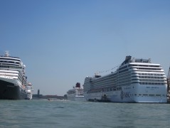 11:04:07 Taken from the vaporetto, near the station. | 11:04:56 The vaporetto heading towards the Rialto / St. Mark's looked insanely crowded, so we decided to go the long way round, to Zattere instead. | 11:05:04 | 11:14:13 Lots of huge cruise liners were moored around the port of Venice. |