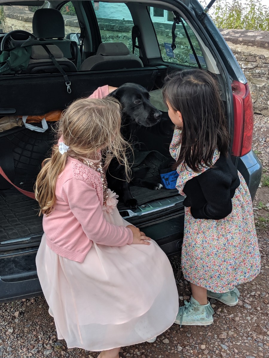 16:58:59 Now Emily has joine the girls on the trampoline. | 17:43:19 Dad and his cousins Nigel and Sarah having a chat at the back of his car. | 17:43:22 | 18:10:50 Jessica and Erika saying hello to Jess the dog. |