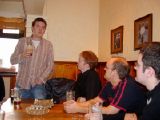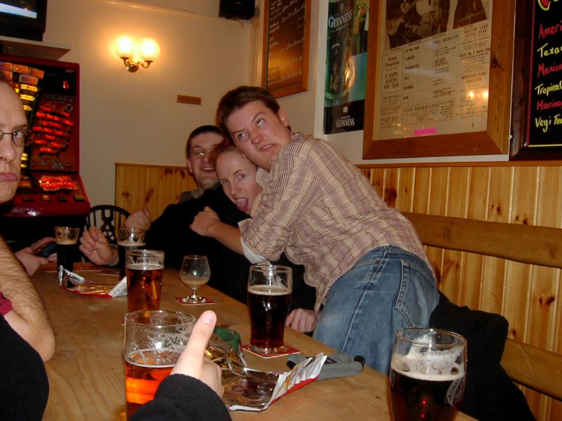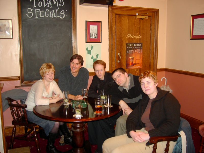 12:15:45 In the first pub now, the Catpisser's Arms. Everyone else had happily sat down at a table up the top somewhere but I forced them to join me in the dank cellary bit down the bottom, which had a distinctive odour of feline urine. Well I liked it anyway (the table that is, not specifically the smelll of cat piss). |