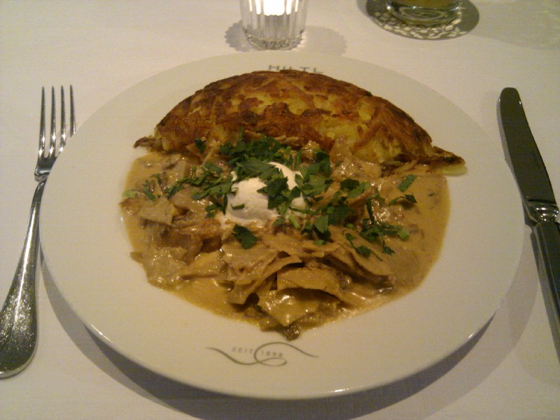 | 20:19:51 Second course: Zuri Geschnetzeltes made with seitan and mushrooms. Had this last time I was at Hiltl as well, and really enjoyed it both times. | 20:38:42 The Twitter wall at Hiltl - does that recent commentary look familiar? | 21:30:19 Bit too dark to see here - but these were band members asleep on a couple of benches. |