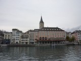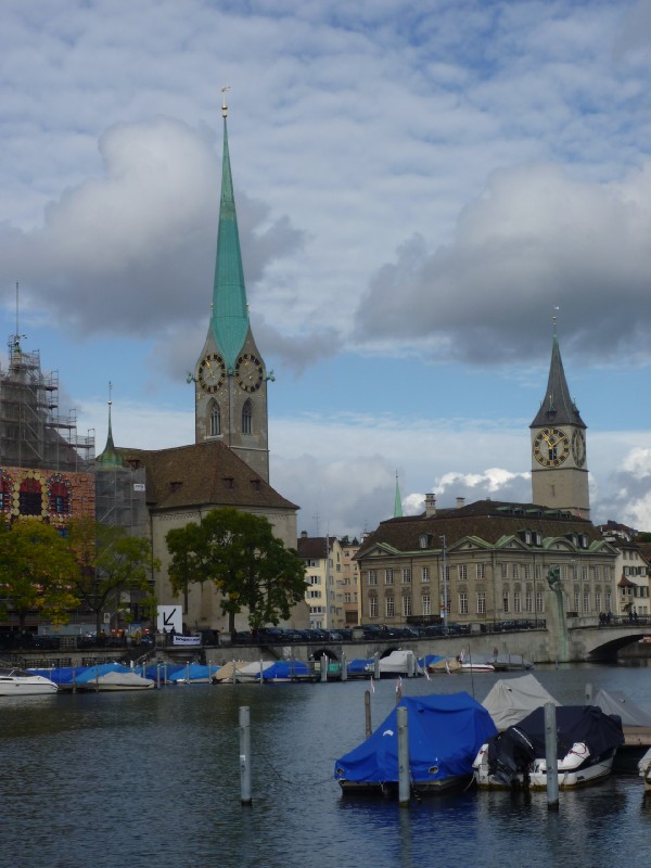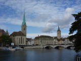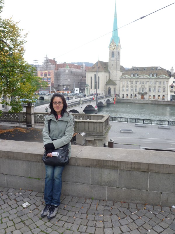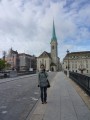 | 11:14:28 Chie having a go at one of Zurich's many public drinking fountains. | 11:15:31 Chie on a bridge. | 11:16:06 The Romanesque cathedral in Zurich. |