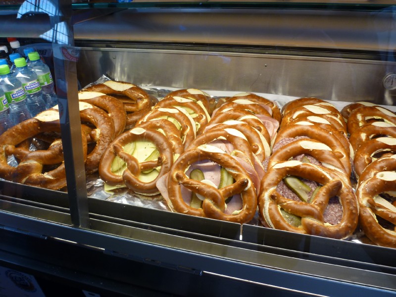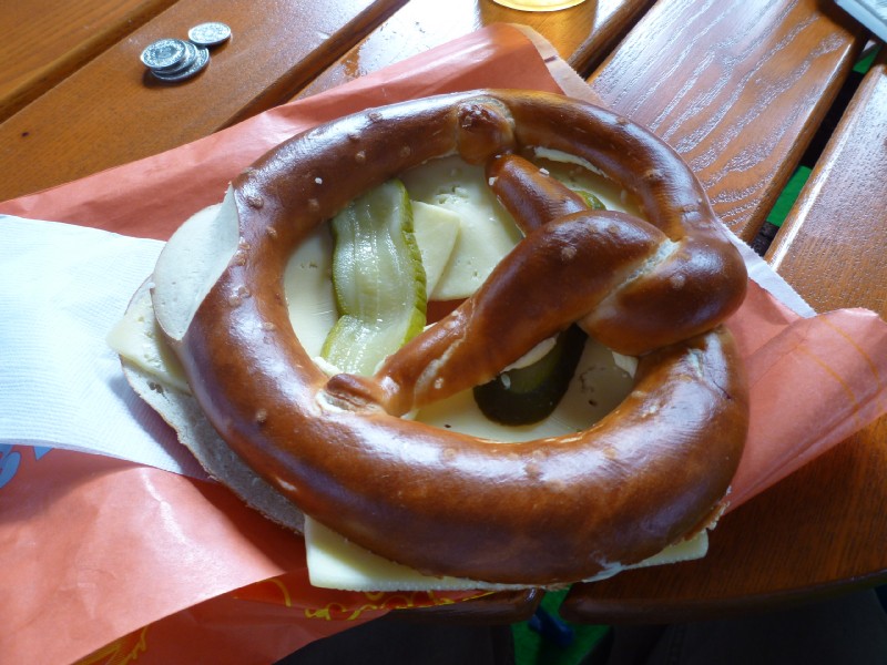 | 11:54:29 Pretzels! | 11:57:03 Lunch - beer, pretzels and sausages (only Chie had the sausages of course). | 11:57:12 Those are gherkins inside there. Very nice too. |