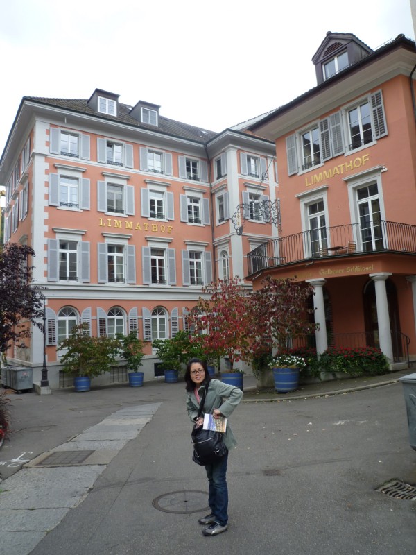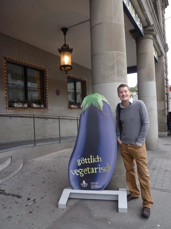 | 16:32:16 Back in Zurich now, here's me by a sign for Bona Dea, one of Zurich's many vegetarian restaurants (although this one looked a bit expensive so we decided not to actually eat here). | 16:32:24 ....me and the sign again. | 16:47:15 Wandering around the streets of Zurich... |