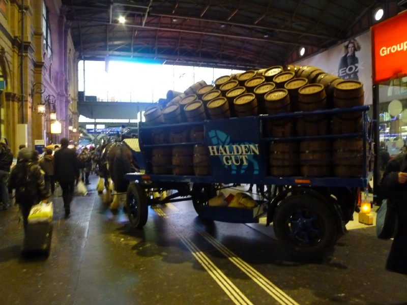 | 18:41:18 A horse drawn carriage full of beer barrels going through Zurich station. | 18:41:33 The horses. | 18:42:01 |