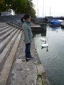 | 10:53:33 Chie on the tram. | 11:08:46 Chie looking at some swans. | 11:10:06 I rather like the sky in this picture, above some of the spires of Zurich. |