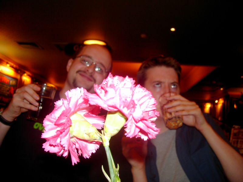 22:25:37 Mark skillfully obscures both eyes with a flower (possibly fake), Rob looks shocked, and I think that might be me thrusting Chie's bag into shot. |