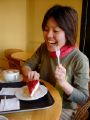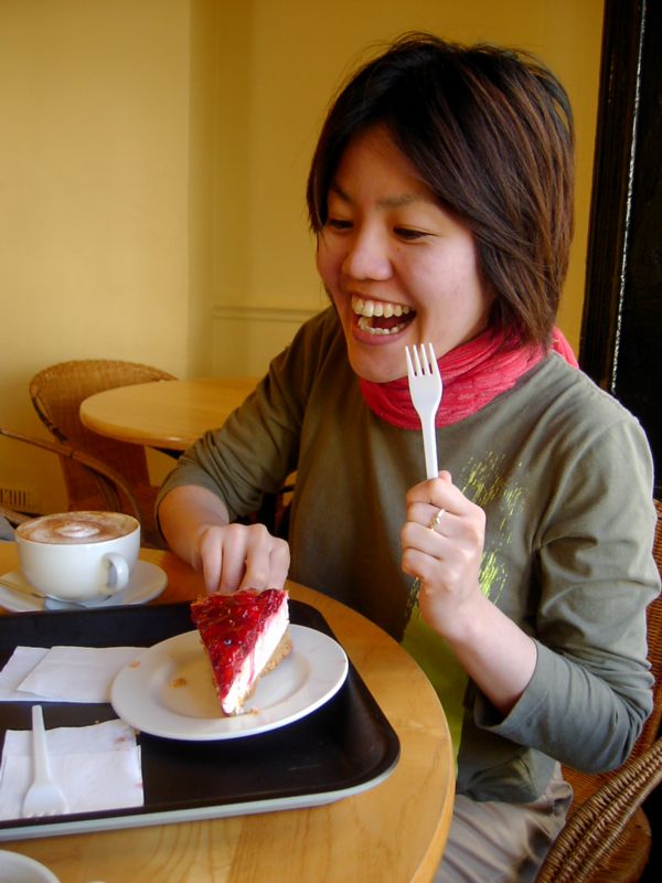 17:19:13 A coffee shop in Brighton, Chie seemingly very pleased about her cheesecake. |