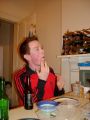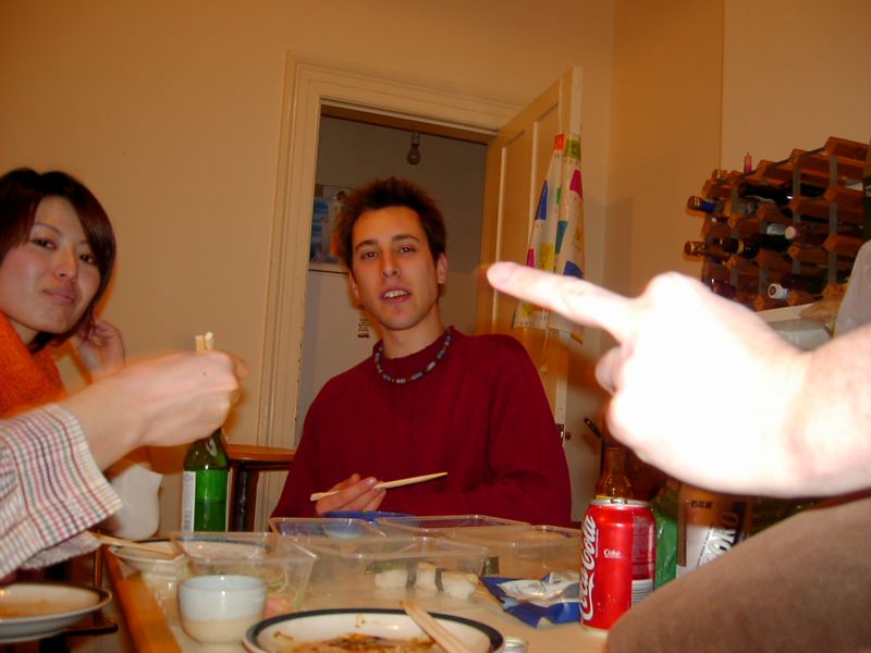 19:43:34 Yes, we kicked the evening off with sushi, sake and Japanese beer, round at Gav's house. Here's Leon impressing all with his nimble chopstick work. |